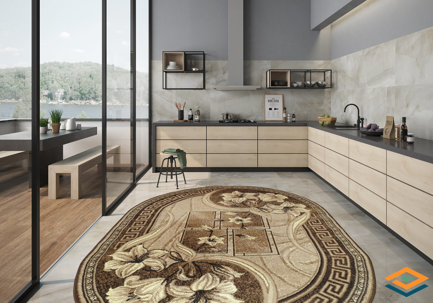 Килими з абстрактнии малюнком, а також однотонні (без малюнка) можуть бути виготовлені з килимових доріжок з використанням професійного оверлока від виробника і не мати бірки зі сторони основи. Це не вважається браком і вироби за цією причиною обміну та поверненню не підлягають