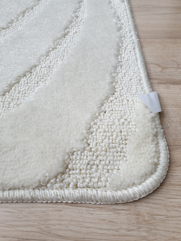 Килими з абстрактнии малюнком, а також однотонні (без малюнка) можуть бути виготовлені з килимових доріжок з використанням професійного оверлока від виробника і не мати бірки зі сторони основи. Це не вважається браком і вироби за цією причиною обміну та поверненню не підлягають